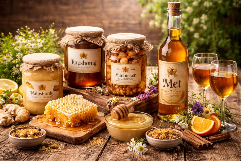 Ergänzt wird das Sortiment durch Honigspezialitäten mit Gewürzen, Kräutern oder Fruchtkomponenten sowie durch Met, auch bekannt als Honigwein. Met wird aus vergorenem Honig und Wasser hergestellt und zeichnet sich durch ein harmonisches Zusammenspiel aus Süße, Würze und Alkoholgehalt aus. Er eignet sich sowohl für den puren Genuss als auch als Begleiter zu deftigen Speisen oder festlichen Anlässen.