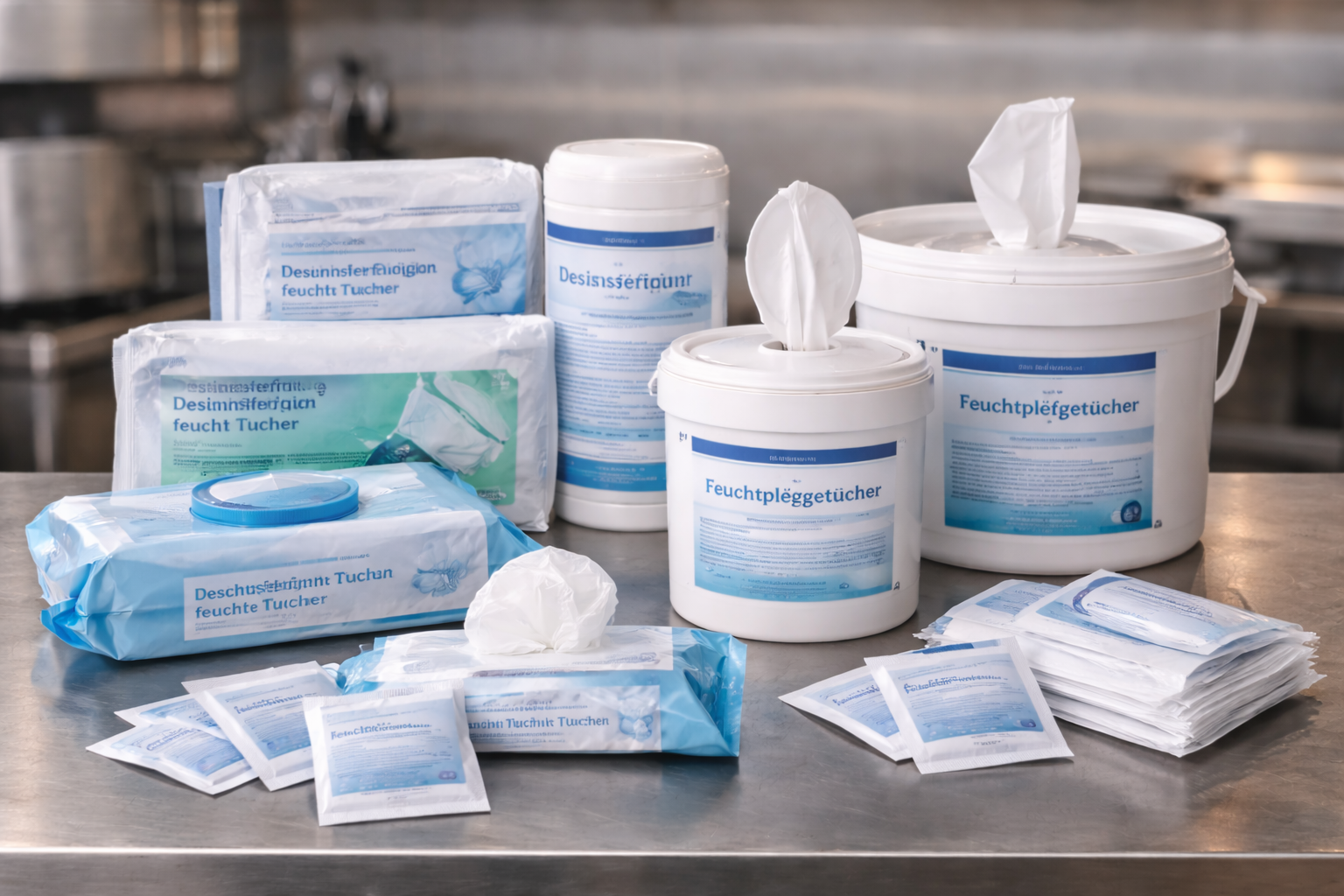 Die Feuchtpflegetücher sind hautfreundlich, pflegend und gleichzeitig stark gegen Schmutz, Fett und Bakterien. Sie eignen sich hervorragend für den professionellen Einsatz, sei es für die Mitarbeiterhygiene, die Reinigung von Arbeitsflächen, Tischen oder Geräten oder für die schnelle Sauberkeit im Gästebereich. Durch die praktische Verpackung, wie Spenderdosen, Einzeltütchen oder Packungen, sind die Tücher jederzeit griffbereit und ermöglichen eine effiziente Hygiene, auch unterwegs oder in Bereichen, in denen schnelle Reinigung erforderlich ist.